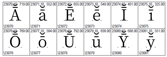 23070: 0100+0306 23071: 0101+0306 23072: 0112+0306 23073: 0113+0306 23074: 012A+0306 23075: 012B+0306 23076: 014C+0306 23077: 014D+0306 23078: 016A+0306 23079: 016B+0306 23080: 0232+0306 23081: 0233+0306 |