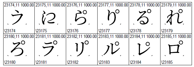 23112: 3089+309A 23113: 308A+309A 23114: 308B+309A 23115: 308C+309A 23116: 308D+309A 23117: 30E9+309A 23118: 30EA+309A 23119: 30EB+309A 23120: 30EC+309A 23121: 30ED+309A |