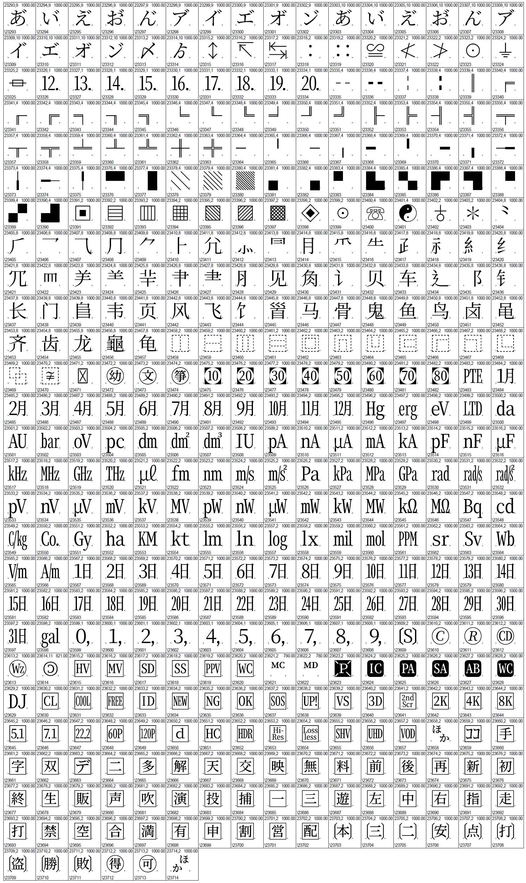 ここまでに出てきたCID+23193~CID+23229の縦書き用グリフです。 |