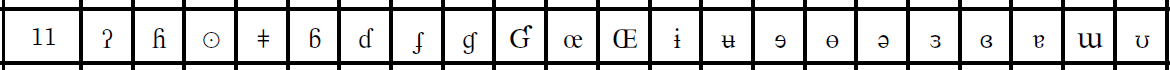 IPA公式サイトにあるUnicode値付きのチャートの2段目、CONSONANTS (NON-PULMONIC) という表の左の列には、吸着音 (Clicks) と呼ばれる記号が5つ縦に並んでいます。このうち1番上のU+0298と、下からの2番目のU+01C2とはAdobe-Japan1-7に収録済みです(それぞれCID+15820、CID+15821)。 残ったU+01C0とU+01C1とについては、それぞれ | (U+007C) および‖(U+2016) のグリフを流用することも検討しましたが、これらのグリフはステムの幅や高さがU+01C2と著しく異なっていて並べた時に統一感がないことから、U+01C0とU+01C1とには別CIDを割り当てました。 |